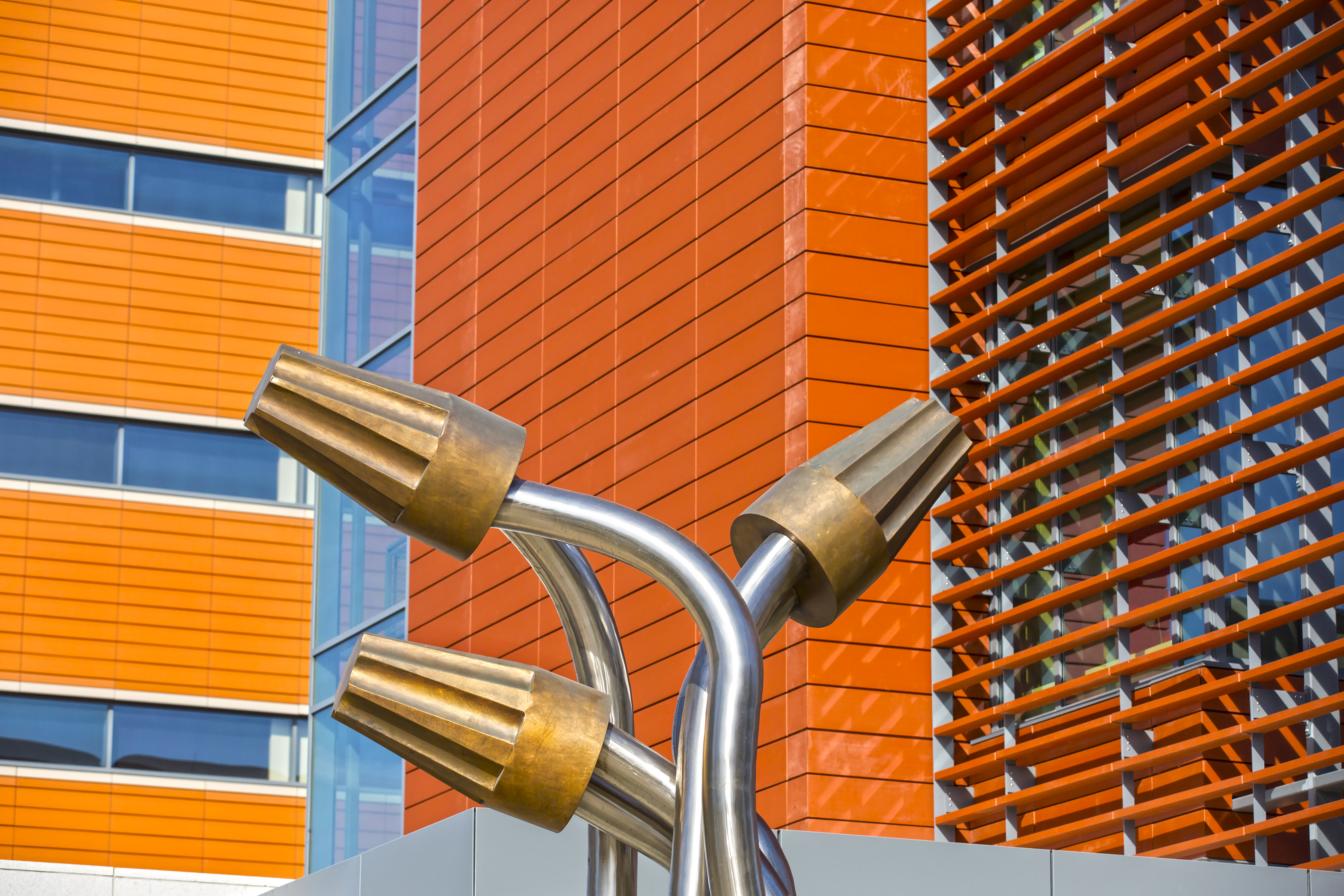 The college unveiled the two, large outdoor sculptures in 2014 as part of the ECE building’s dedication. The Capital Development Board of Illinois Art in Architecture program commissioned the sculptures.