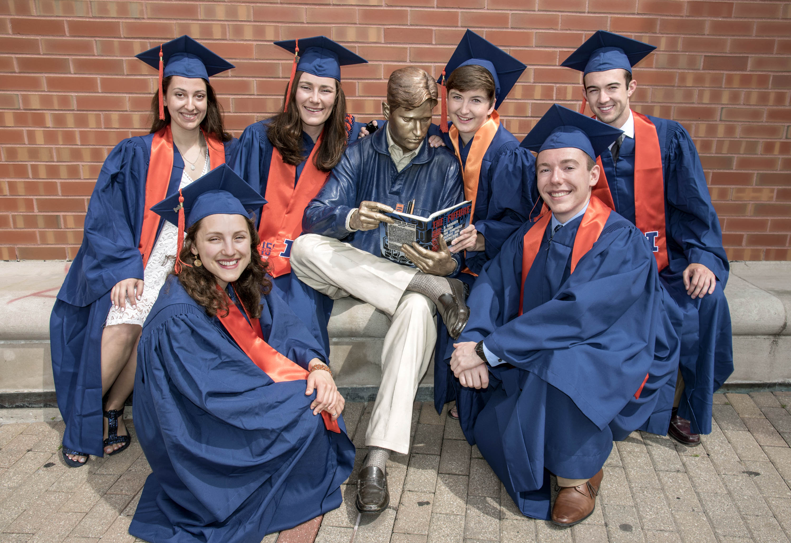 On the south side of Grainger Library, you’ll find the statue affectionately known as Grainger Bob. On campus since 1996, the title of Seward Johnson’s work is “Computing a Future.” Grainger Bob is the second most photographed statue on campus (the most photographed is Alma Mater), has his own Twitter/X account and is reading the book Computing the Future. He has a twin who lives at the Schaumburg Township District Library.