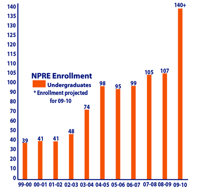 Last fall, NPRE had a total of 107 undergraduates. This year, that number is expected to reach 140-plus. That compares with numbers in the 40s in the early years of this decade.
