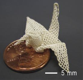 Although it looks small and unassuming, the tiny origami crane sitting in a sample dish in professor Jennifer Lewis’ lab heralds a new method for creating complex three-dimensional structures for biocompatible devices, microscaffolding and other microsystems. The penny-sized titanium bird began as a printed sheet of titanium hydride ink.