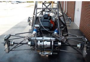 The team began with the 2008 car from Illinois Formula SAE car which they stripped down to the chassis and suspension as a starting point. From that point, they began to engineer their power train. To power the car, they decided on a series design. After some modifications to the chassis, the team installed a Briggs and Stratton go-kart engine coupled with a three-phase ac generator. As the go-kart’s internal combustion engine runs, a belt drive cranks the generator which produces around eight additional horsepower, which is stored in a lithium-iron phosphate battery system designed by Lee. A three-phase motor drive then inverts the dc battery current back into three-phase ac current that runs the drive motor. An integrated control system helps to manage the storage and selection of power.