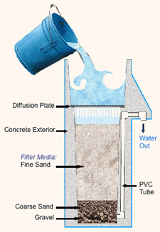 "Once water is poured into the filter and allowed to pass through the sand, microbial and algal colonies develop in the top portion of the sand column and form a biological film, or biofilm. The biofilm helps strain or inactivate helminthe (worm) eggs, protozoa (such as Giardia and Cryptosporidium), and infectious bacteria from the water. Secondly, because dissolved metals in the water oxidize and subsequently precipitate throughout the sand column, the negatively-charged bacteria and viruses may be attracted and adsorbed to the positively-charged metal oxides in the sand and removing them from water.