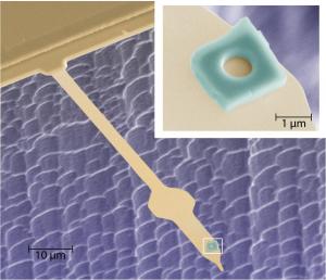 The researchers first pulverize the large crystals of SRO, provided by Yoshiteru Maeno’s group at Kyoto University who discovered the superconductivity of SRO, into fragments, choose a likely micron-sized flake, and drill a hole in it using a focused beam of gallium ions. The resulting structure, which looks like a microscopic donut, is glued onto the sensitive silicon cantilever and then cooled to 0.4 degrees above absolute zero.