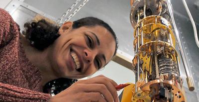 Nadya Mason adjusting a cryostat in her laboratory in the Frederick Seitz Materials Research Laboratory,