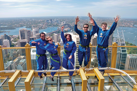 GLCM students enjoying the Sydney Eye Skywalk Tour. From left: Faraaz Rab, Margeaux Goff, Amna Mahmud, Pedro Alvarez and Samuel Ball.