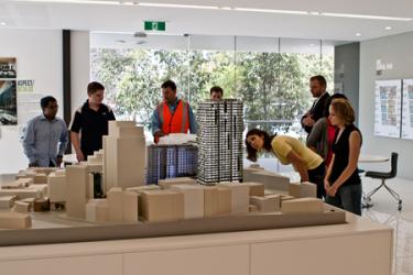 Brad Sugar (left), Project Manager for 1 Central Park, explains the project to GLCM students using an elaborate architectural model. Photo by Pedro Alvarez.