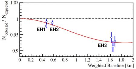 The copious data revealed for the first time the strong signal of the effect that the scientists were searching for, a so called “mixing angle” named theta one-three (written θ13), which the researchers measured with unmatched precision. Theta one-three, the last mixing angle to be precisely measured, expresses how electron neutrinos and their antineutrino counterparts mix and change into the other flavors. The Daya Bay collaboration’s first results indicate that theta one-three, expressed as sin2 2 θ13, is equal to 0.092 plus or minus 0.017.