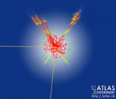 Simulated production of a Higgs event at the ATLAS detector on the Large Hadron Collider (LHC) at CERN.