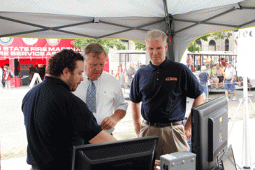 Tim Yardley (l.) and Tom Overbye (r.) of the University of Illinois explain part of the exhibit to David Vaught (c.), acting director of the Illinois Department of Commerce and Economic Opportunity.