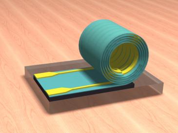 Using the self-rolling technique, the researchers can shrink the area needed for a radio-frequency inductor to a scant 45 microns by 16 microns – more than 100 times smaller than the area an equivalent flat spiral would require.
