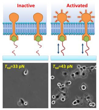 In the TGT approach, Ha and Wang repurposed DNA strands, using them as tethers for ligand molecules, to test the tension required to activate cell adhesion through integrin. The integrin bonds to the tethered ligand, and adhesion is activated only if the DNA tether does not rupture (See video animation).