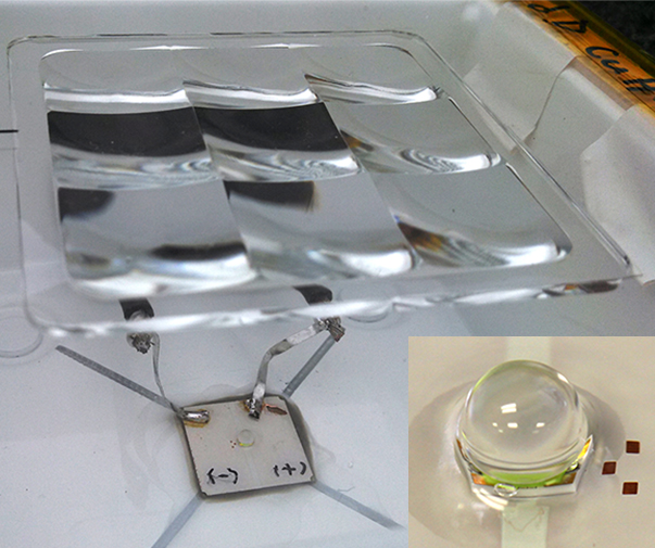 The project involved a collaborative team of researchers at the University of Illinois and the photovoltaic companies Semprius and Solar Junction. According to the group’s paper, the module’s top cell consists of a three-junction (3J) microcell with its own anti-reflective coating to ensure efficient transmission of light to the uppermost layers. The bottom cell uses a diffused-junction germanium (Ge) architecture. In a stacked 3J/Ge assembly, the top 3J cell captures light with wavelengths between 300 nm and 1,300 nm. Wavelengths from 1,300 nm to 1,700 nm pass through to the bottom Ge cell with minimal interface reflections, due to the use of a thin layer of a unique type of chalcogenide glass.