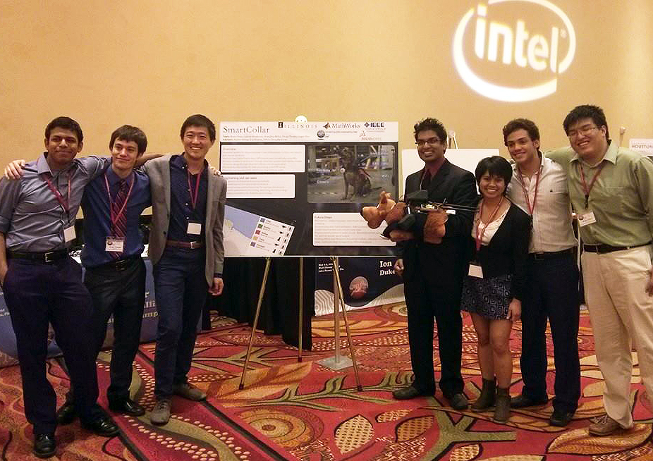 The University of Illinois “SmartCollar” student project won the People's Choice award at the Cornell Cup USA competition presented by Intel. Thirty-four finalists were chosen to compete in the competition finals held May 1-3. The team consisted of undergraduate students Logan Wan (MechSE), Brian Chien, Shugo Tanaka, Gabriel Hruskovec, and Anarghya Mitra (ECE); dog trainer Eva Alvarez (undergraduate student in animal sciences); and mentors Aadeel Akhtar (MD/PhD student, neuroscience), and Dan Block (instructor, ECE).