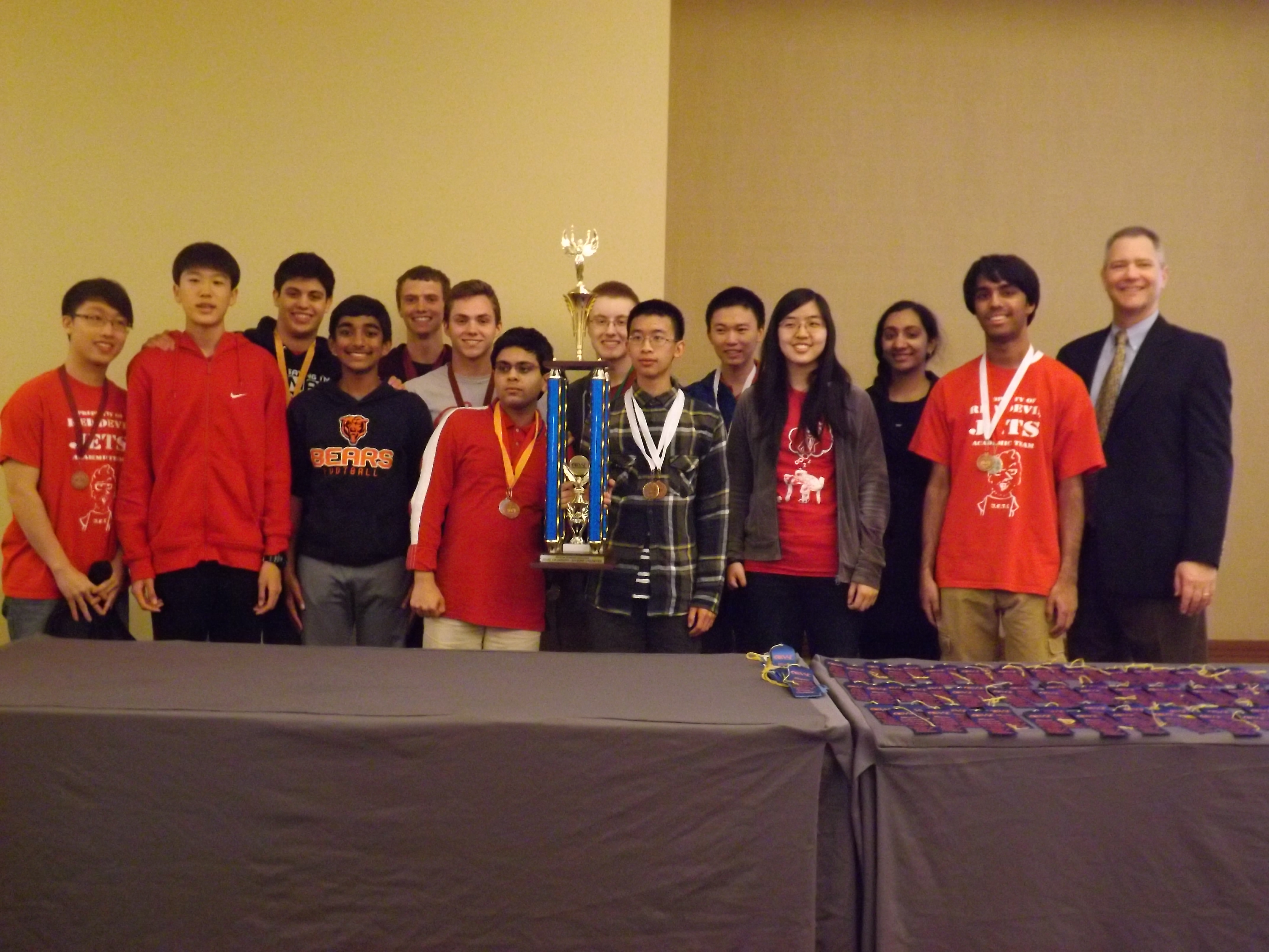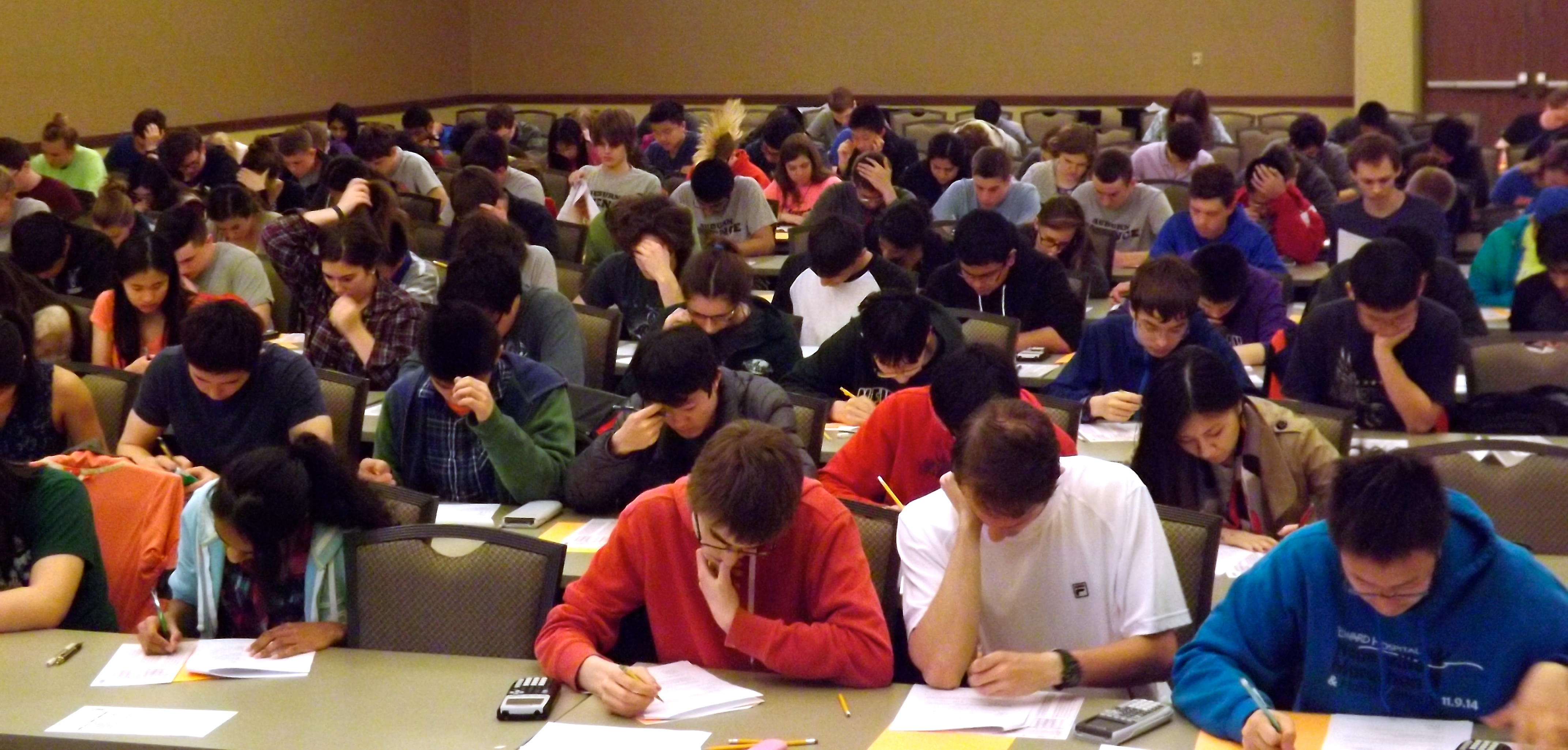 Teams consisted of 14-member varsity teams or as individual at-large competitors. Each student took two exams. There are seven subject areas from which each student chose their two tests -- biology, chemistry, computer science, engineering graphics, English, mathematics and physics. The materials for tests are drawn from senior high school and freshman level college curricula and are written by teams of college and university faculty. Each test production team produces three tests of increasing levels of difficulty for the regional, sectional and state finals.