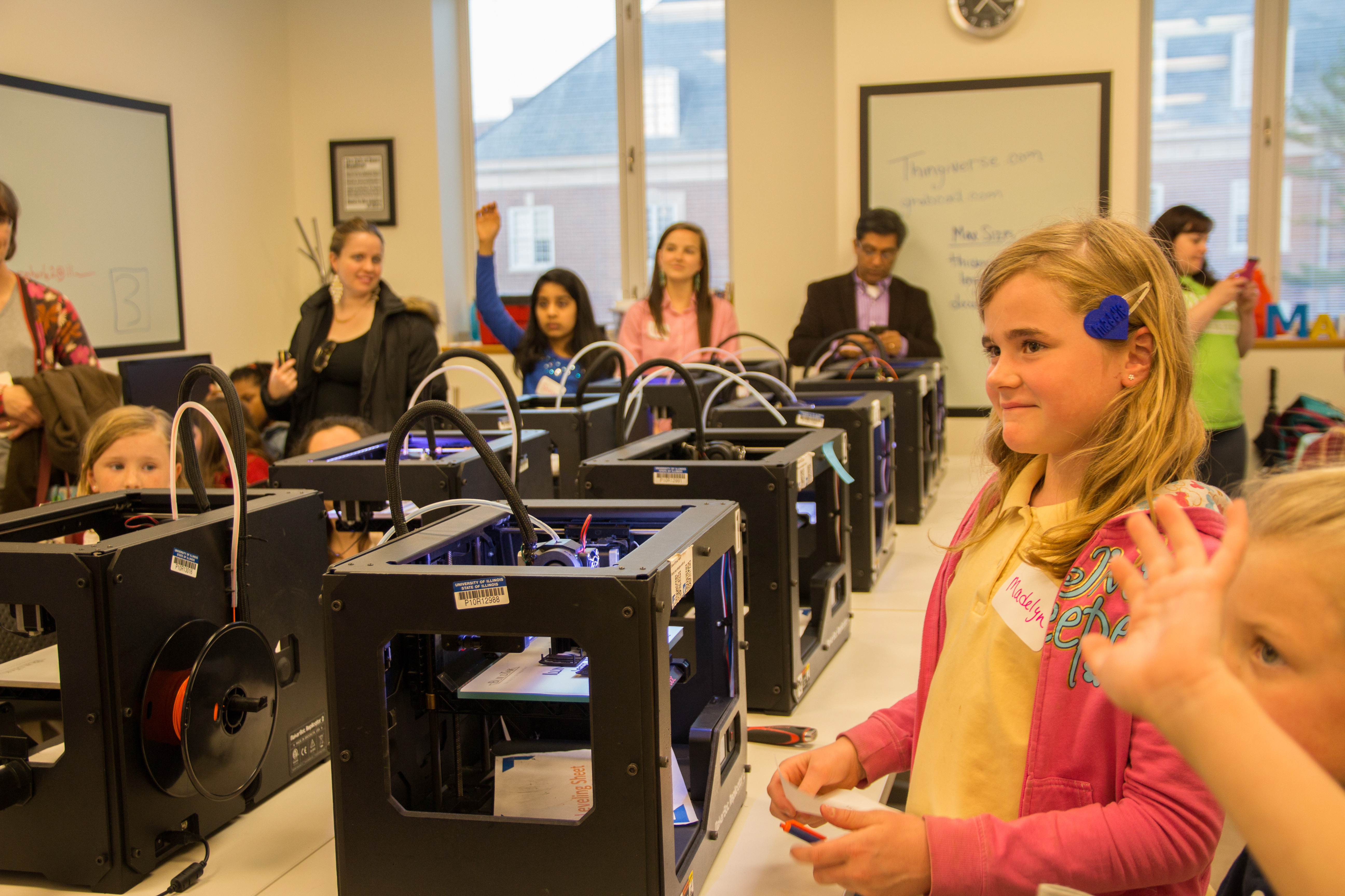 Following the presentation, participants are given one-on-one training on basic computer aided design (CAD), and the girls have the opportunity to then create an object related to the theme and watch it print on one of the lab’s 3D printers.