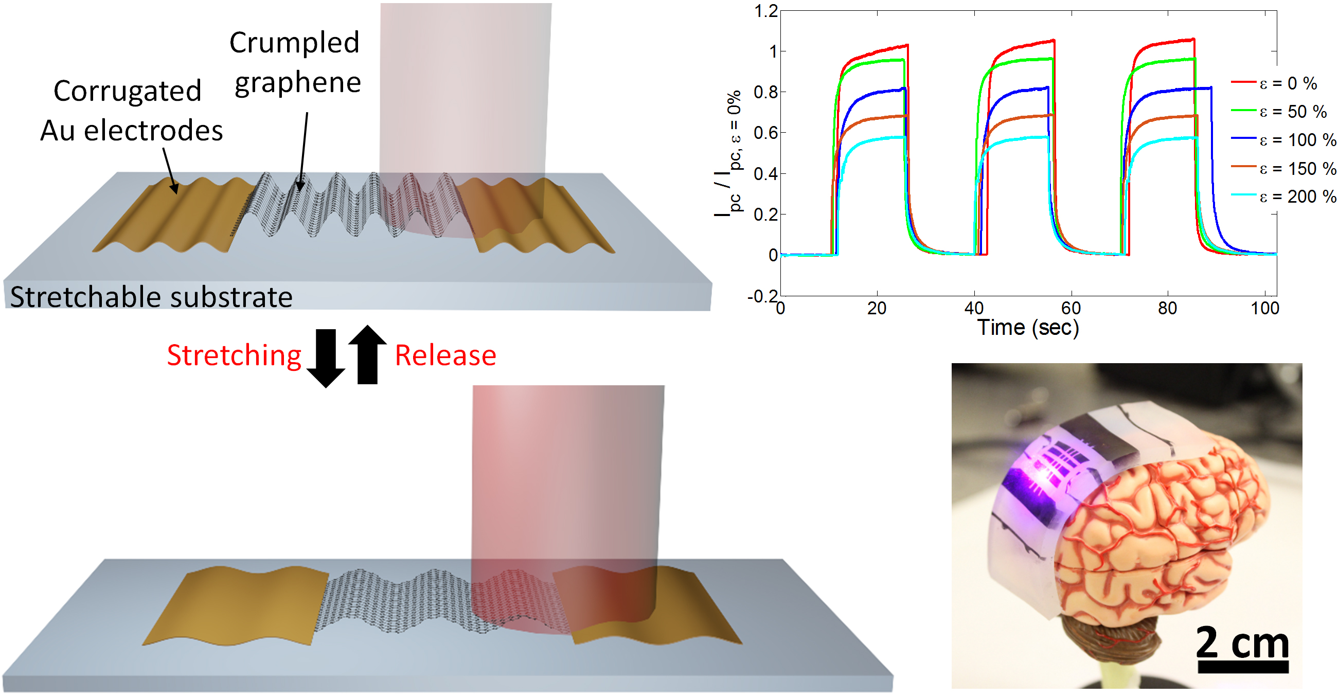 “This work demonstrates a robust approach for stretchable and flexible graphene photodetector devices,” Nam added. “We are the first to report a stretchable photodetector with stretching capability to 200% of its original length and no limit on detection wavelength. Furthermore, our approach to enhancing photoabsorption by crumpled structures can be applied not only to graphene, but also to other emerging 2D materials.”