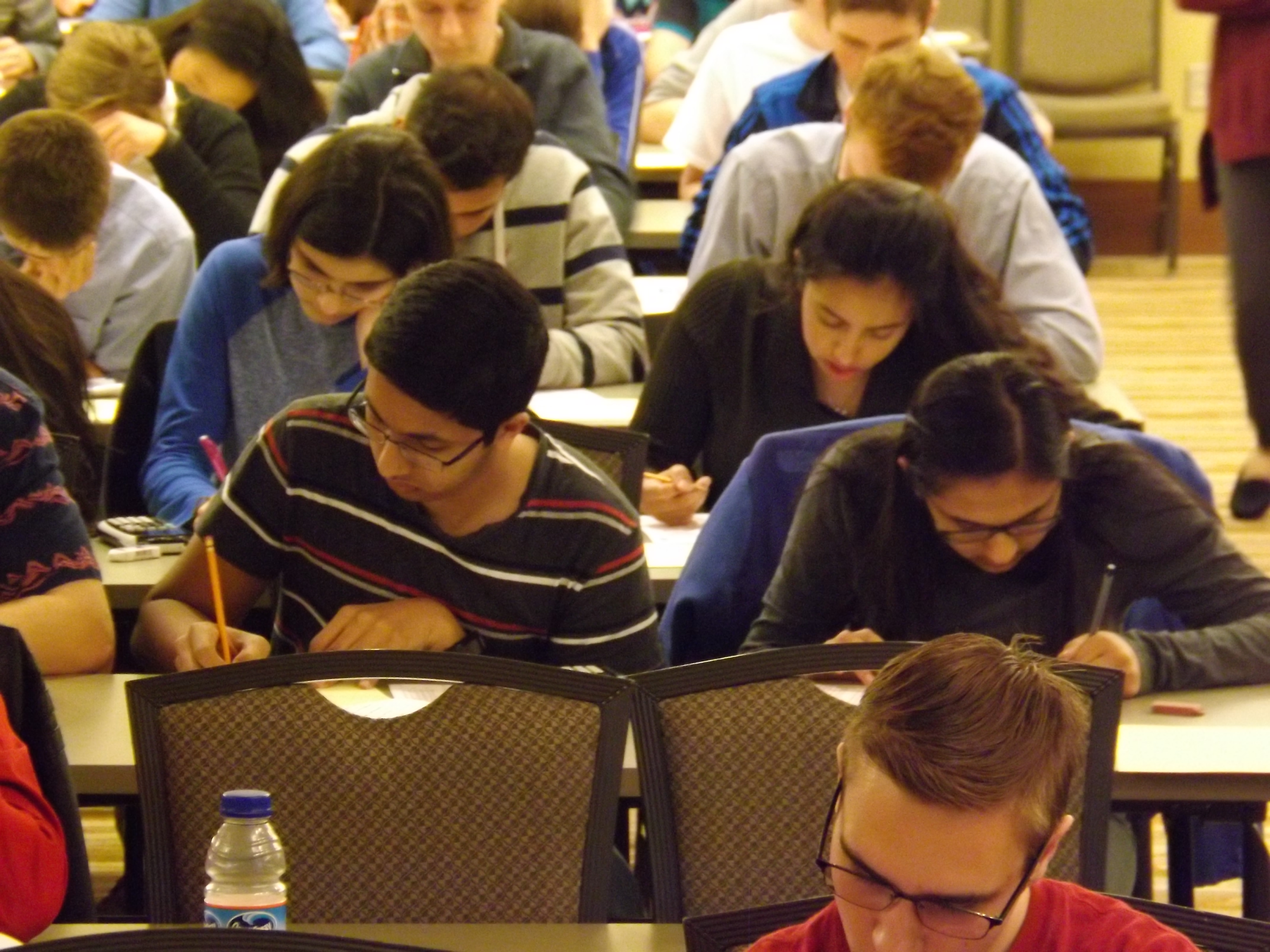 Teams consisted in 14-member varsity teams or as individual at-large competitors. Each student took two exams. There are seven subject areas from which each student chose their two tests -- biology, chemistry, computer science, engineering graphics, English, mathematics and physics. The materials for tests are drawn from senior high school and freshman level college curricula and are written by teams of college and university faculty. Each test production team produces three tests of increasing levels of difficulty for the regional, sectional and state finals.