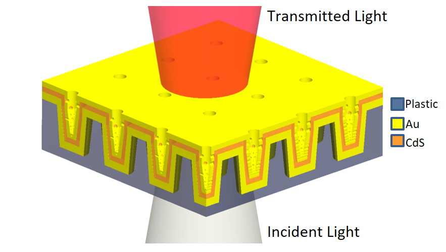 “The nanocup array provides extraordinary optical transmission,” Hackett added. “If you take a thin metal film and try to shine light through it, there will be almost no light transmitted. However if you put a periodic array of nanoholes, or in our case a nanocup structure, then what you see is a resonance condition where at a certain wavelength, you will have a peak in the transmission through this device.”